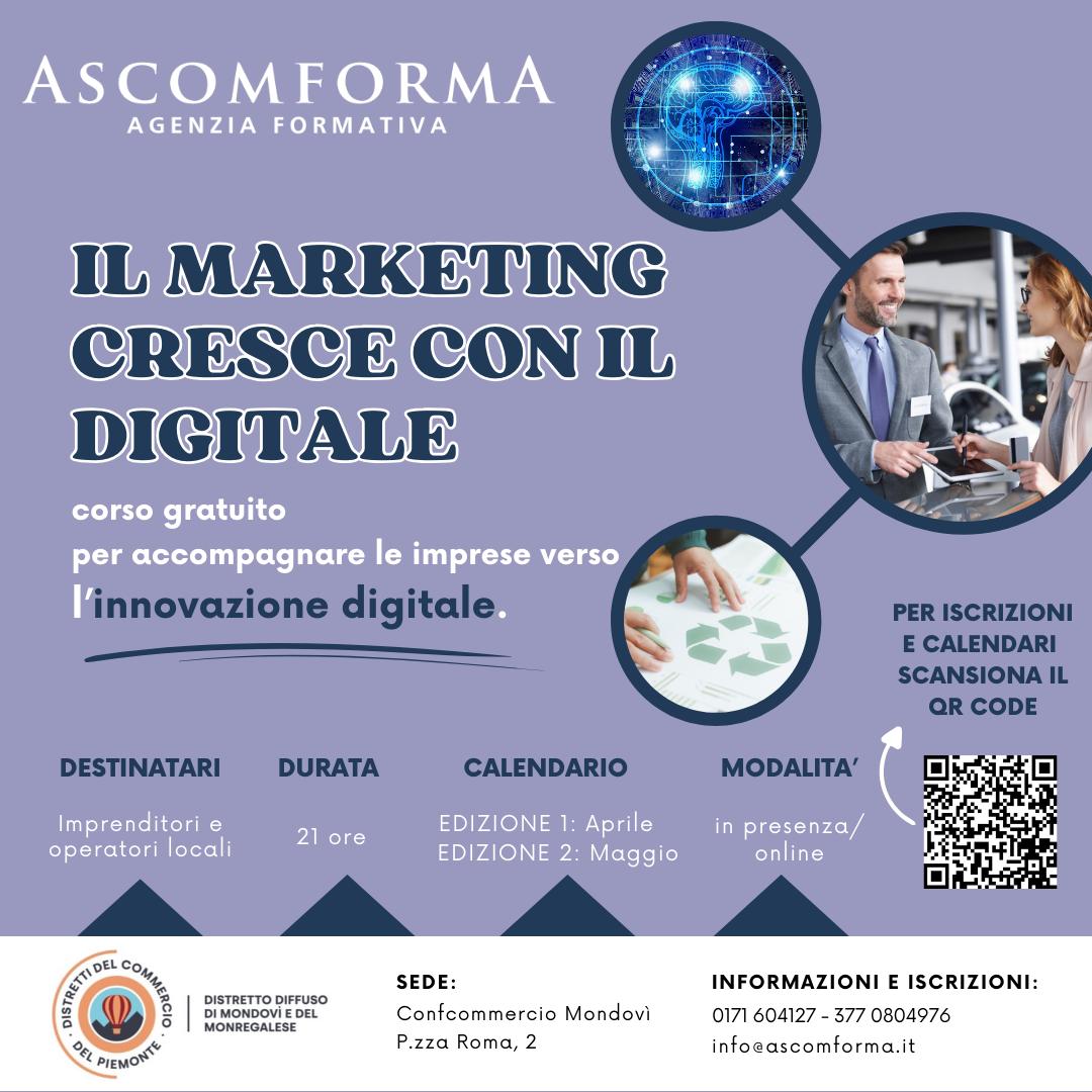 Prenderà avvio questa sera, mercoledì 1° aprile 2026, il primo modulo formativo "Il marketing cresce con il digitale" promosso da Ascomforma e inserito all'interno del Distrutto Diffuso del Commercio di Mondovì e del Monregalese. Un'opportunità conoscitiva gratuita rivolta a imprese ed esercenti, la cui fruizione può avvenire sia in presenza che in remoto attraverso il QR code dell'immagine allegata. Tra gli argomenti trattati all'interno della proposta formativa, la collaborazione tra aziende, la competitività e la fiducia, l'economia collaborativa e circolare, l'identità e lo storytelling, l'intelligenza artificiale e il digital marketing per le imprese. Per eventuali informazioni e iscrizioni: 0171.604127 ; 377.0804976; info@ascomforma.it.